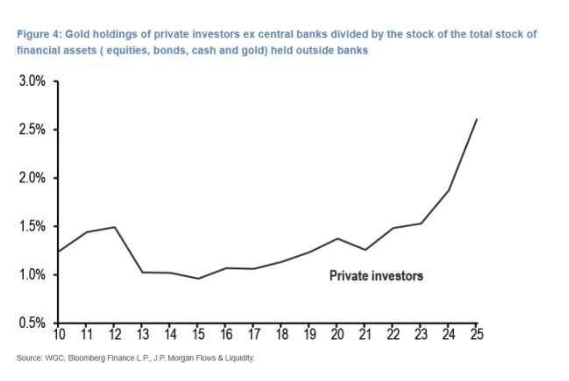 他们计算发现,全球非银行投资者将2.6%的资产配置到了黄金中。