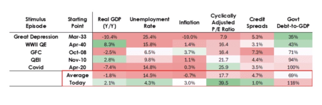 他列出一张表格,展示以往刺激政策出台的背景,以此凸显当前形势的不同。