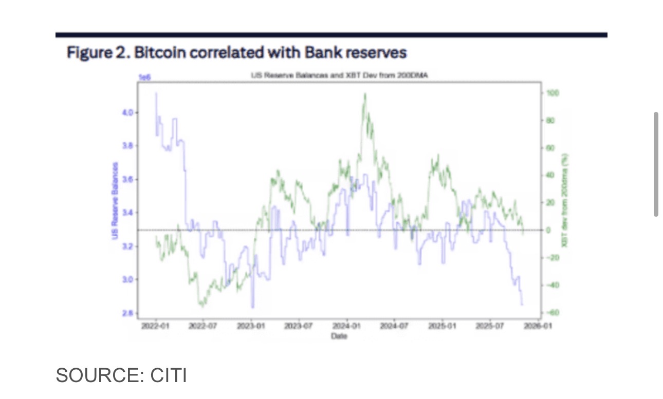 按照传统,准备金下降也会对股市造成负面影响,但这种情况直到本周才出现。花旗认为,比特币可能是衡量纯粹流动性变化的更敏感工具,尤其是在股市被人工智能的基本面叙事所牵动的背景下。