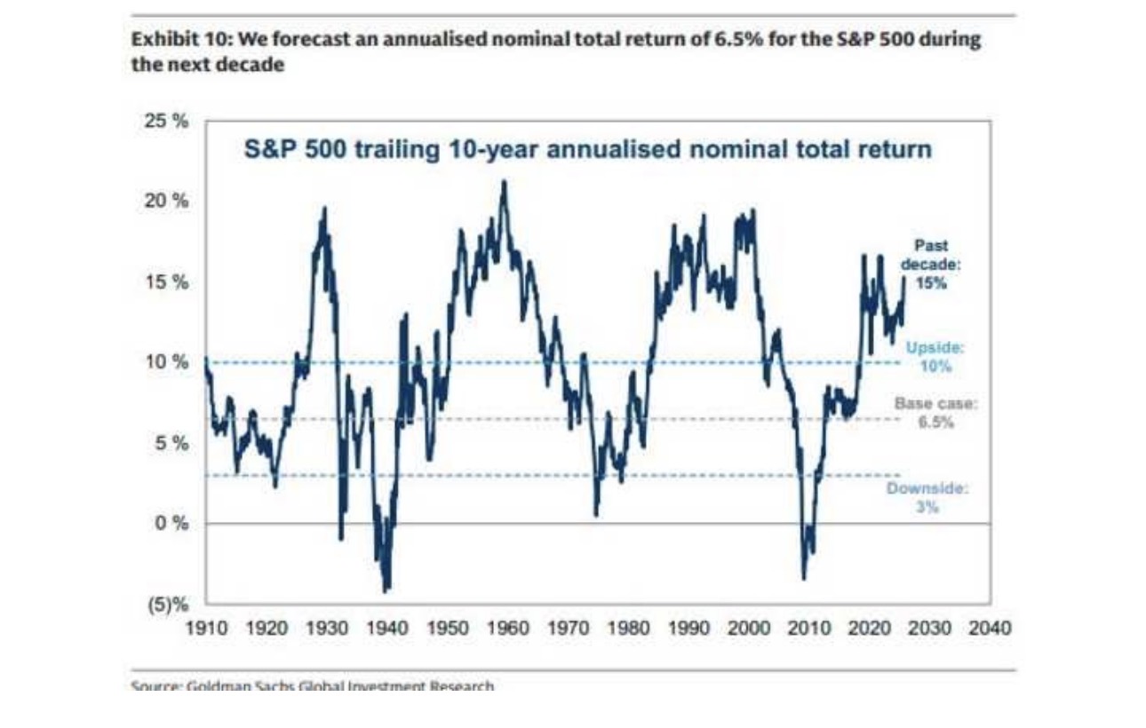 高盛预计,标普500指数未来年化回报率为6.5%,其中包括6%的每股收益年化增长、1%的估值年化下滑,以及1.4%的平均股息收益率。