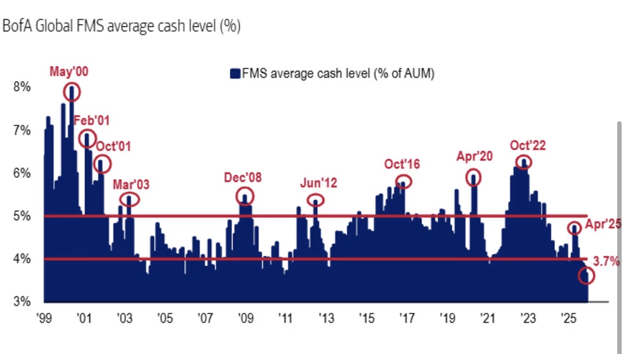 这份11月调查揭示出一个明确的风险信号:投资者对股票的配置比例已升至2月以来的最高点,而投资组合中的现金水平仅为3.7%,已触发技术性卖出信号。