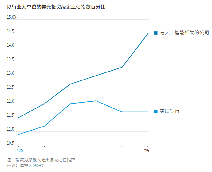 在高评级的投资级债券市场中,摩根大通信用研究策略师认为,“与人工智能革命最密切相关”的发行方,如今占摩根大通美元投资级公司债指数的14.5%。