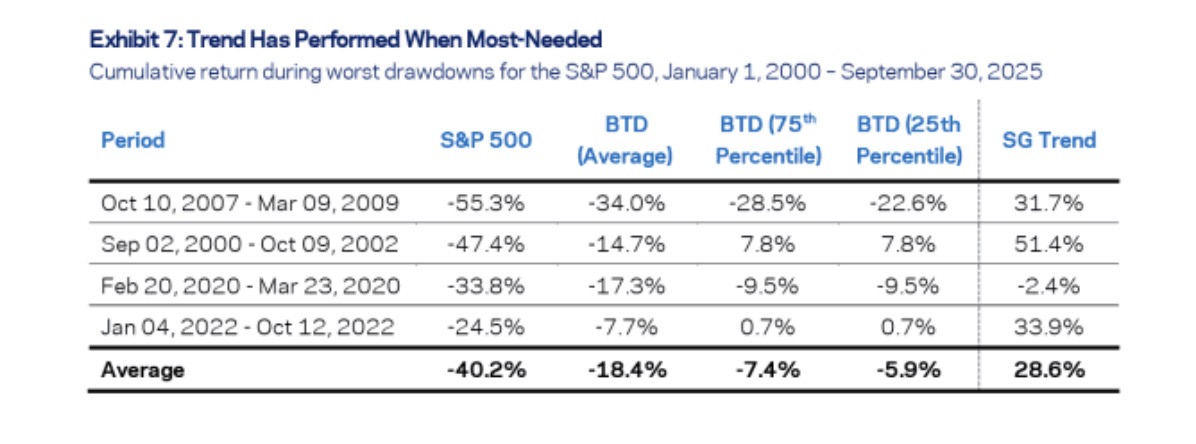 相比之下,趋势跟随在市场下跌时能提供真正价值。研究四轮下跌时段,逢低买入策略平均下跌18%,标普500平均下跌40%,而趋势策略上涨29%。(市场观察)
