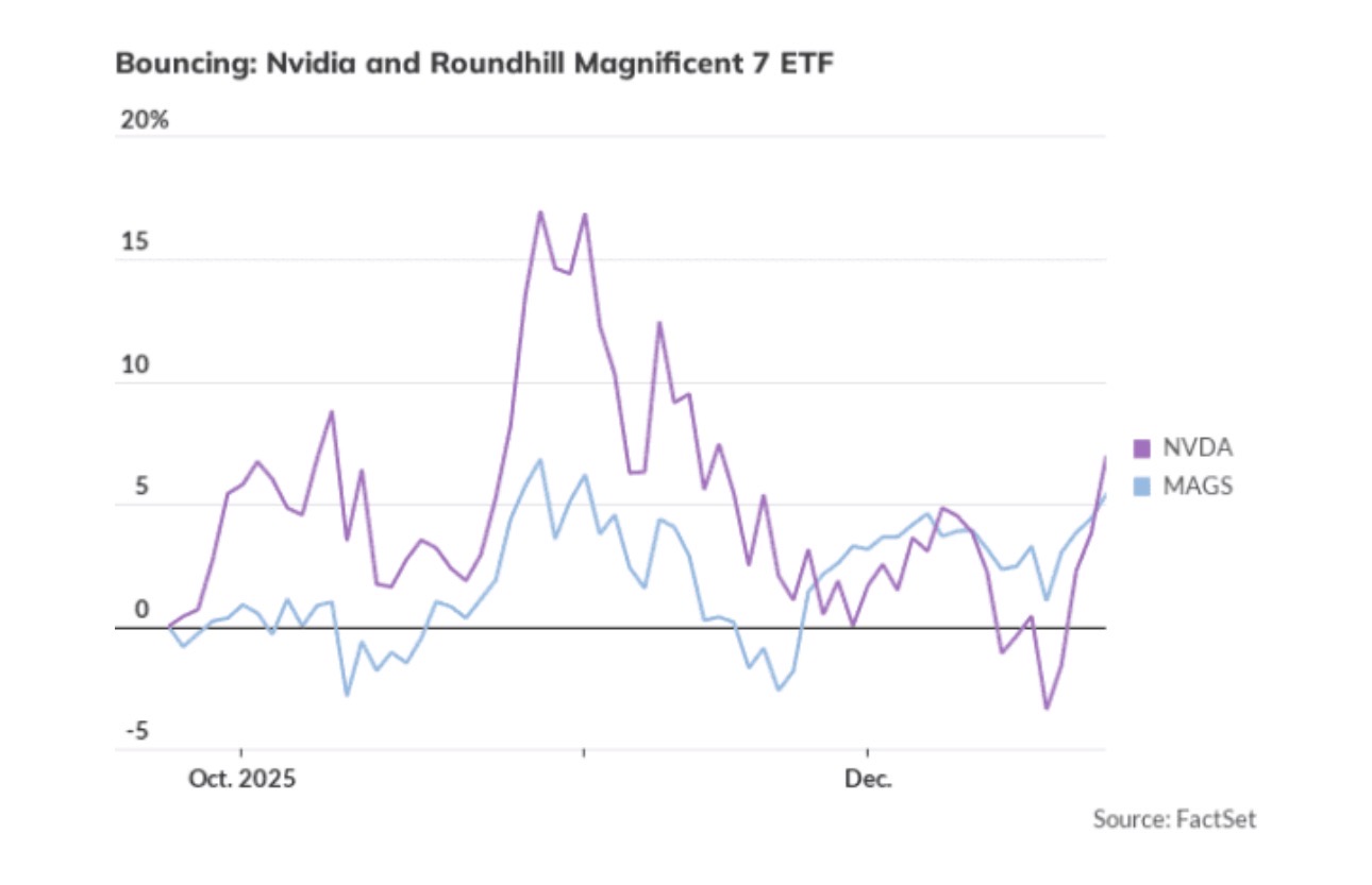 “我曾指出,英伟达的周期组合预计将在12月底触底,并持续向上直到2026年2月。从技术面来看,这种反转似乎已在本周发生,并与Roundhill推出的华丽七雄ETF(MAGS)出现突破同步。”他说。