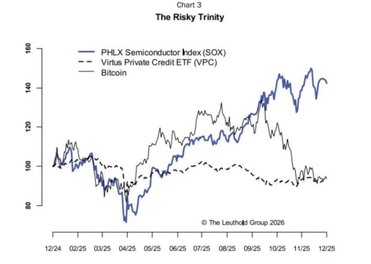 Chun Wang指出,如今市场中“被严重低估的最大风险”,就是三大长期热门投资主题的“史无前例的趋同”:人工智能、比特币与私人信贷。