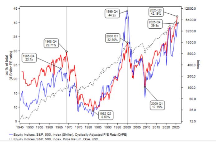 首先是估值。虽然估值在短期内并不是判断市场时机的良好指标,但在中长期具有重要意义。他指出,根据最新数据,美国股市的席勒CAPE(经周期调整的市盈率)为39.9,是有记录以来的第二高水平。