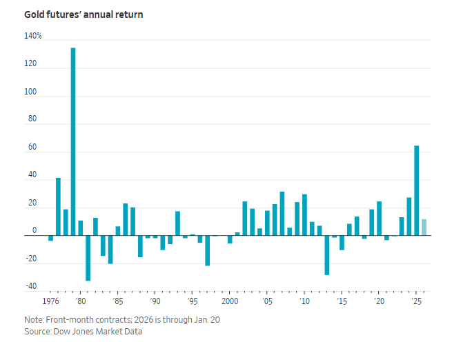 这一模式在2025年得以延续。在经历了2024年27%的涨幅后,黄金在2025年又上涨了65%。