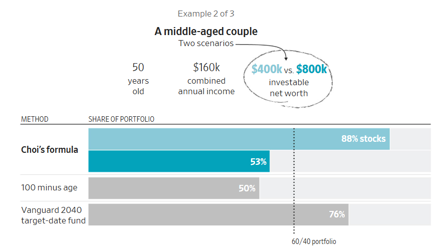 但当这对夫妇可投资资金增加一倍时,公式建议的股票比例大幅降低至53%。因为在这种情况下,提高股票配置比例,会让他们一生财富中更大部分承受股市风险。