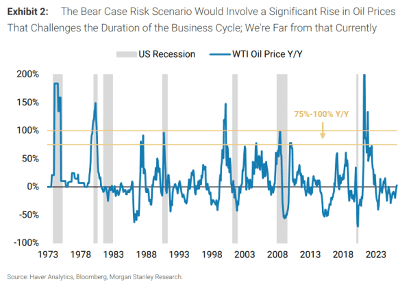 因此,威尔逊指出,与上周末发生在伊朗及整个中东地区的事件相关的股市看空情景,将是油价大幅且持续上涨,从而长期来看对经济周期构成风险。