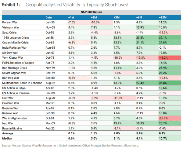 威尔逊在周一发布并与市场观察分享的一份报告中表示,从历史上看,地缘政治风险事件并未给股市带来持续性的波动。