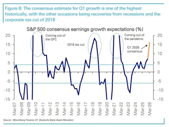 德意志银行称,这将是四年来最高的季度增长水平,高于第四季度的13.4%,也高于过去两年8.5%至14%的区间。在过去二十年中,如此强劲的一致预期仅出现过三次:2008至2009年全球金融危机后的深度复苏、新冠疫情后的反弹,以及2018年企业减税带来的推动。