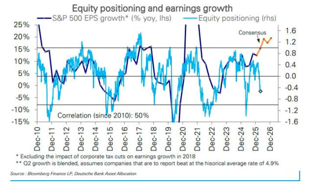 “股票仓位历史上与盈利增长高度相关,目前的仓位水平反映出市场预期盈利增长即将转为负值,这与我们预计第一季度将出现的强劲增长形成鲜明对比,”德意志银行表示。(市场观察)