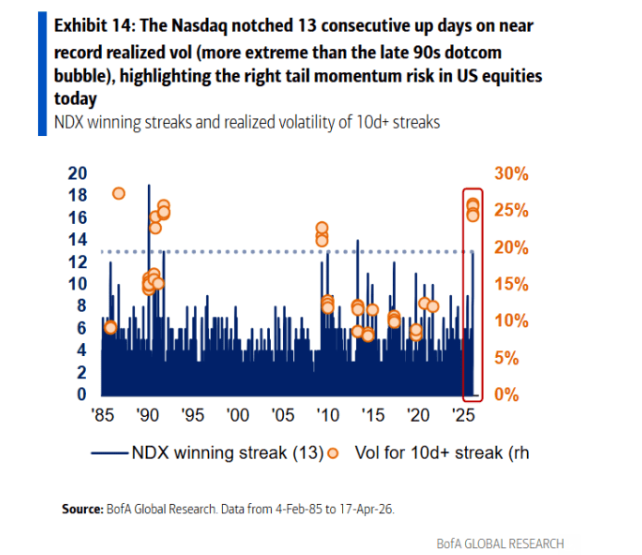 他们表示,纳斯达克100指数连续13天上涨,实际波动性甚至超过了上世纪90年代末互联网泡沫时期的极端水平。标准普尔500指数的涨势同样可以与历史上一些高波动时期相媲美,例如新冠疫情、全球金融危机以及1987年股灾。