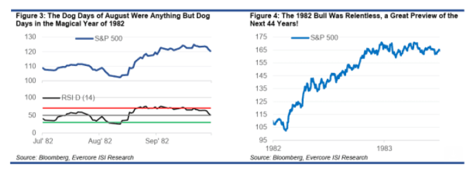 事实上,多头希望1982年能够重演。因为尽管当年市场迅速进入超买状态,但从8月低点开始,接下来的14个月中,市场上涨了69%。