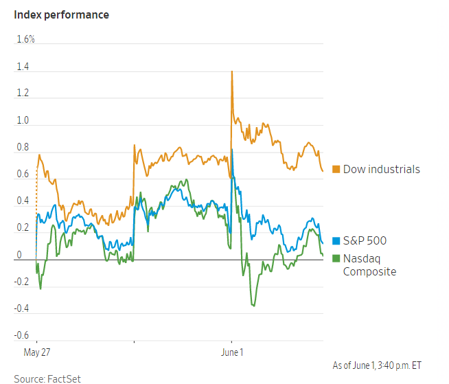 三大指数都从盘初的较大涨幅中回落。截至收盘,标准普尔500指数略跌0.05%,此前该大盘指数连续第四个月上涨。以科技为重点的纳斯达克综合指数下跌0.09%。道琼斯工业平均指数上涨约46点,涨幅0.13%。