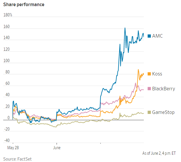 泡沫资产周三继续上行行情。网红股AMC在向对冲基金Mudrick Capital出售股票的消息公布后,股价暴涨超过100%,最终收于62.55美元,涨幅95.6%。黑莓股价也加入了大军,上涨了31.3%,GameStop上涨了近13.4%。