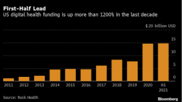 据彭博社周二报道,针对数字健康公司的投资继续打破纪录,今年上半年美国该行业获得147亿美元的投资,已经超过了2020年全年的投资。