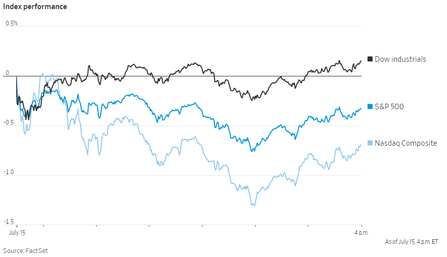道琼斯工业平均指数小幅上涨0.15%,标准普尔500指数走低0.3%。纳斯达克指数下滑0.7%,为连续第三个交易日下跌,是自5月19日以来最长时间的跌势。