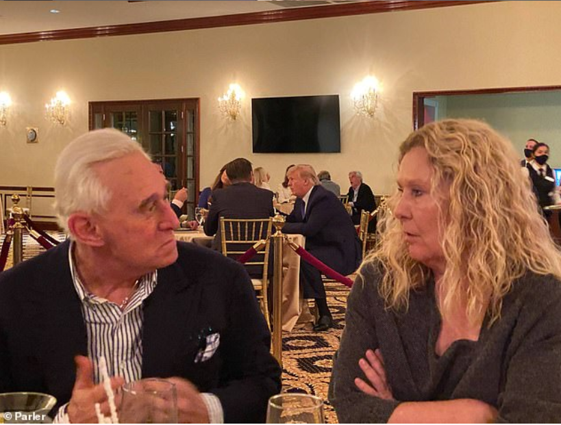 斯通还贴出了一张他和特朗普总统上周日(12月27日)晚上在高尔夫俱乐部的餐厅里共进晚餐的照片,照片中麦卡蒂坐在他们旁边,盖佛尔坐在他身后的餐桌上。