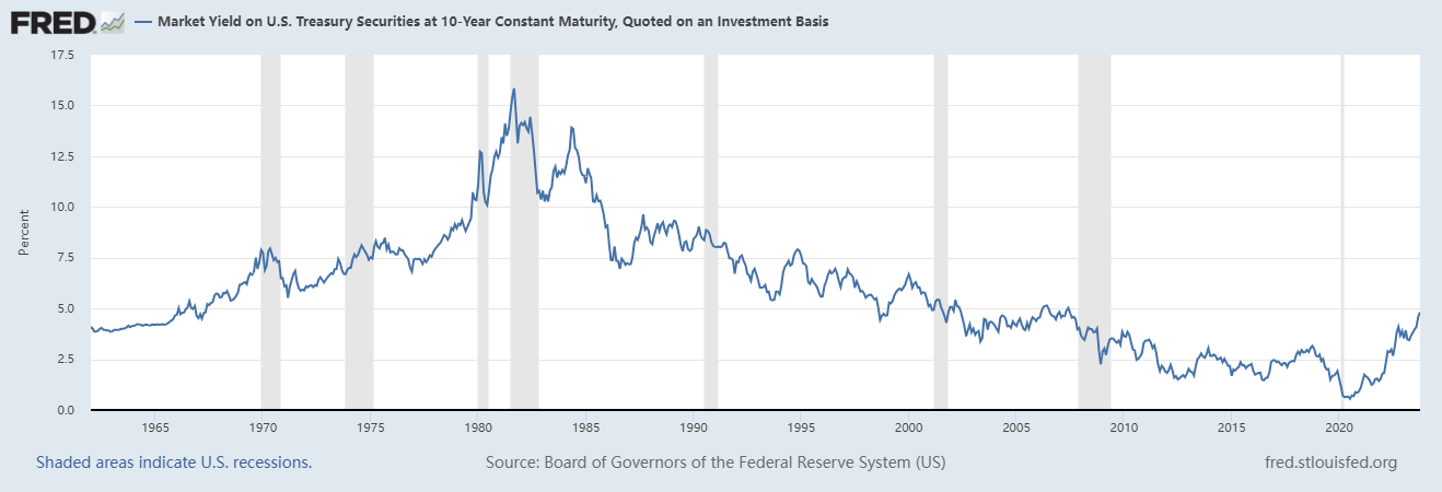 对于惶恐不安的投资者,有三点快速的情绪支持: 首先,收益率有所上升,但并不是特别高。美联储经济数据服务机构 FRED 的数据显示,自 1962 年以来,10 年期国债日均收益率比现在高出一个多百分点,为 5.9%。自 1971 年以来,30 年期抵押贷款平均利率为 7.7%,而近期为 7.3%。
