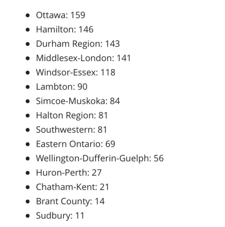 最新确诊的病例包括多伦多931例,皮尔郡531例,约克郡241例,尼亚加拉地区168例和滑铁卢地区165例。