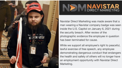 在挂牌哥们儿被网民指认出后,他所就职的营销公司Navistar火速发出一条公告,宣布立即将该员工解职。声明中说,该公司支持员工行使和平合法的言论自由权利,但不能容忍其员工对其他人的健康和安全做出危险行为。公告中没有给出这名员工的真实姓名,大概算是对挂牌哥的最后一点仁慈。可怜挂牌哥,参加了一场捍卫理想的活动,最后竟然落得理想和工作同时破灭的结局。