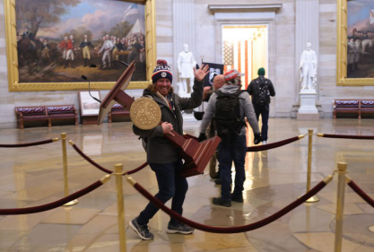 来自佛罗里达州的亚当·约翰逊因为一张单手抱着议长演讲台的同时向拍摄者挥手微笑的照片而一夜爆红。估计约翰逊和两毛五大爷巴内特一样,也是打心底里认为自己没偷没抢,只是“拿”了一件战利品。当天他还在脸书网页上直播了自己进入国会的过程。