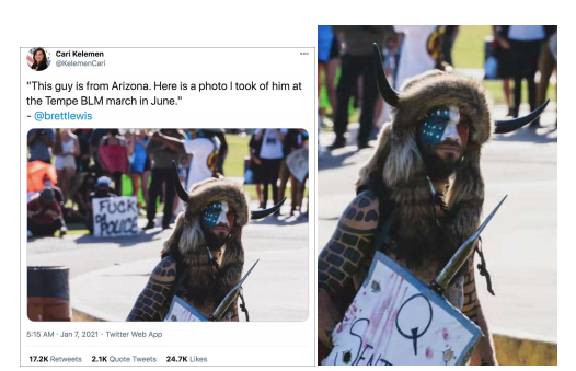 事态变得不可收拾之际,原本将聚集到国会山周围的川粉称之为“爱国者”并不停鼓励他们的川普核心圈人士开始甩锅,牛头大神首当其冲成为第一“衰锅”。有人说他是极左组织安提法的成员,还晒出他在BLM游行时的照片,以此证明坏事都是安提法干的,和川粉无关。