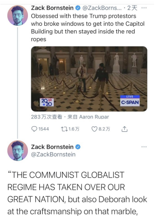 推特上有一段直播视频显示的是川粉初期进入国会大厅的场景。不知道是不是国会大厦内部的气氛太肃穆,这些川粉在冲破警察的封锁、爬墙、砸烂门窗闯入国会内部时,竟然自觉地顺着大厅内围栏围出来的路径前进,完全没有革命者的气势。