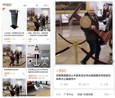 约翰逊的蜜汁微笑激发了大洋彼岸淘宝商户的灵感,转眼美国国会议长演讲台就成了淘宝商品,有卖家称是“朋友昨天闯进国会拿的”,也有比较实诚的说要“慢收”,最让人佩服的是一位卖家,把约翰逊的头P成了普京大帝,还在商品名中加上川粉最爱听的“再次让美国伟大”。壮哉,大淘宝!