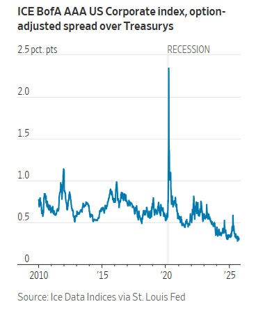 相比之下,在过去两次经济衰退中,这一利差曾超过2个百分点。如今,利差如此之小,以至于最优质的债券收益率,甚至被压低到低于国债的水平。