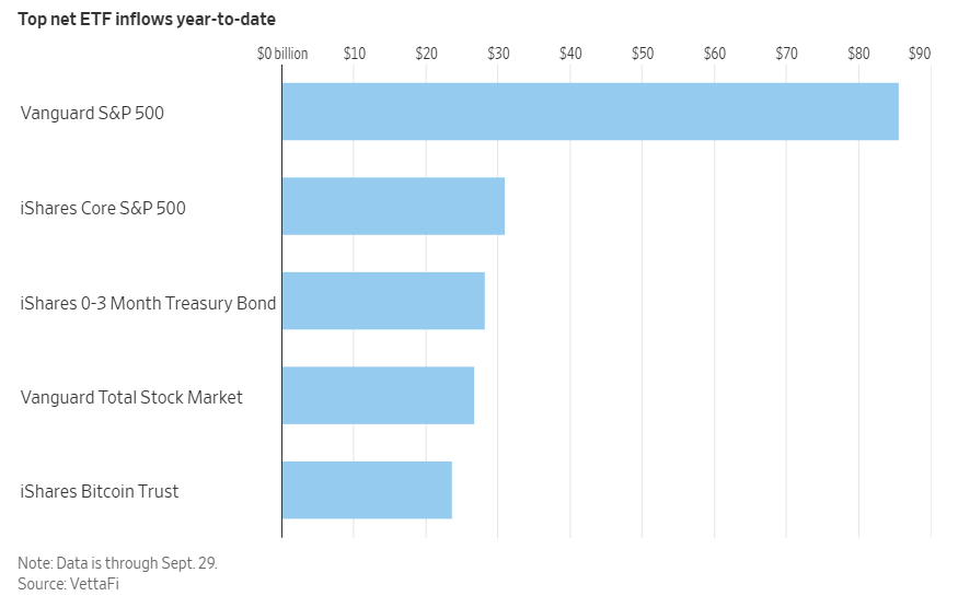 两个熟悉的名字在资金流入排行榜上居于前列:先锋集团的标普500 ETF(代码VOO)和贝莱德的iShares核心标普500 ETF(代码IVV)。这两只指数基金,加上道富推出的类似产品,截至9月下旬,年内合计吸引了近1400亿美元的净流入,几乎相当于每天交易日吸金10亿美元。