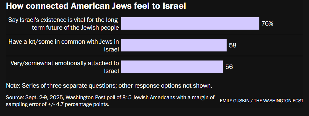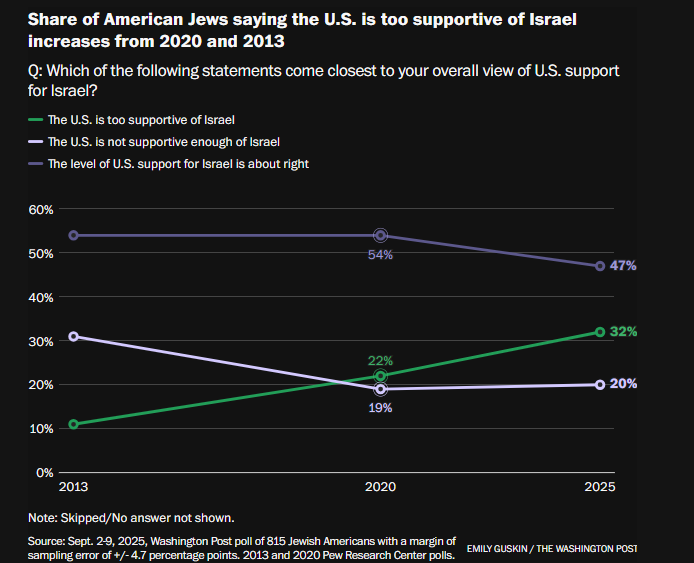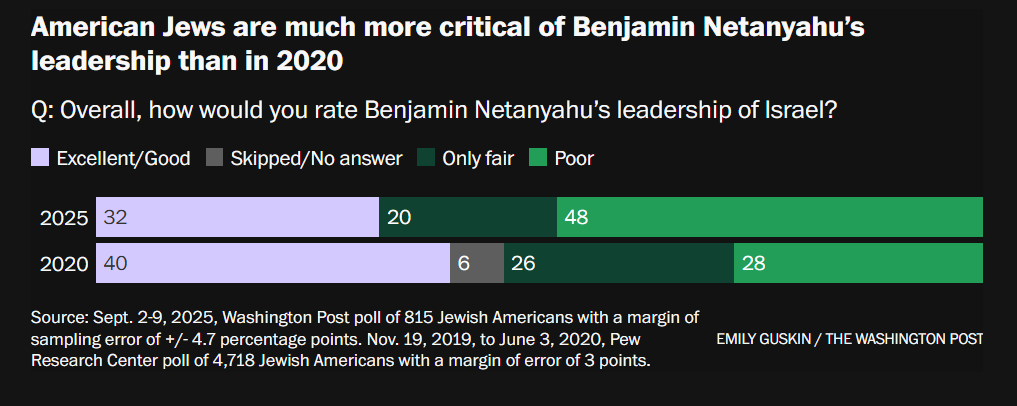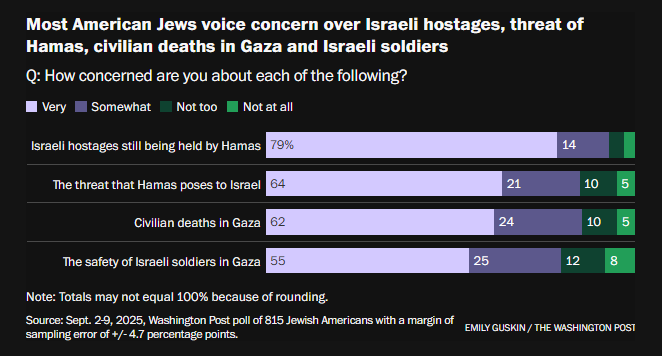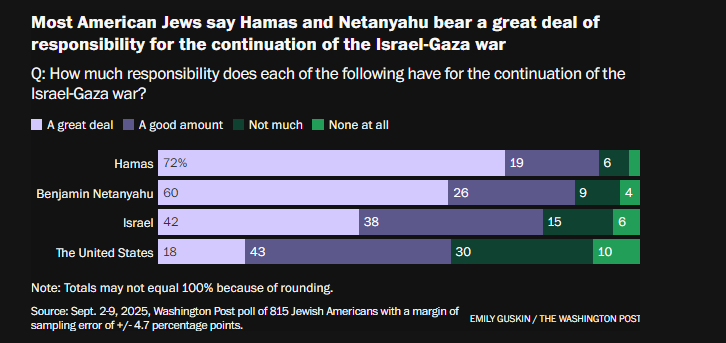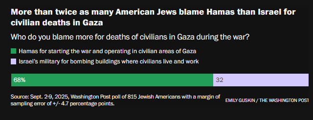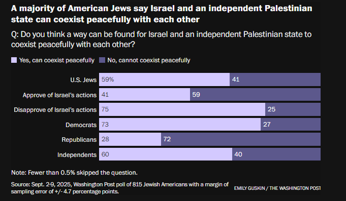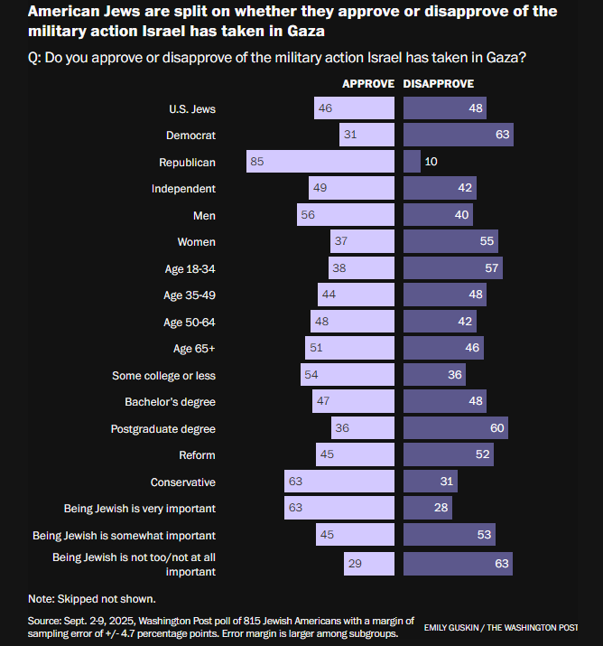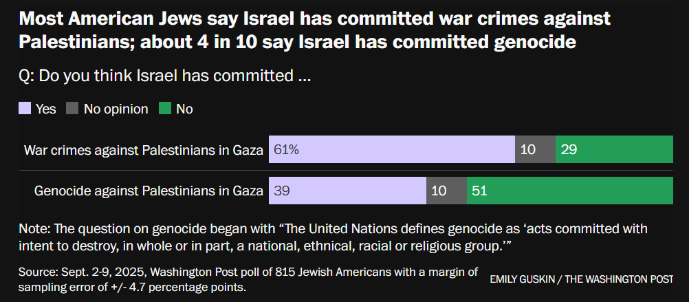 根据《华盛顿邮报》的一项民调,许多美国犹太人强烈反对以色列在加沙的战争行为,61%的人认为以色列犯下了战争罪,约四成的人认为以色列对巴勒斯坦人实施了种族灭绝。