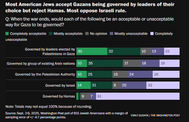 62%的美国犹太人表示,接受由民选巴勒斯坦政府来治理加沙,而只有4%的人表示可以接受哈马斯执政。然而,在2006年巴勒斯坦地区举行的选举中,正是哈马斯赢得了胜利。