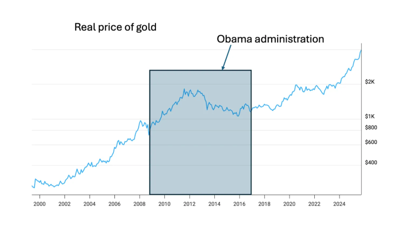确实,黄金的实际价格——也就是金价除以整体消费者价格水平——在奥巴马上任初期显著上升。