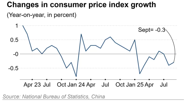 与此同时,消费者价格指数(CPI)同比下降0.3%,虽较8月0.4%的跌幅有所改善,但仍受到猪肉和新鲜蔬菜等食品价格下滑的拖累。环比来看,CPI上涨0.1%。