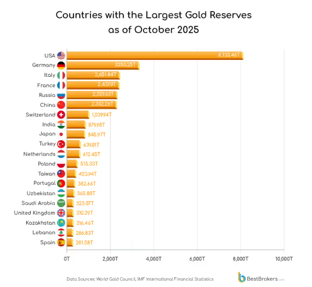 根据投资研究平台BestBrokers援引世界黄金协会与国际货币基金组织的数据,截至10月,美国是黄金储备最多的国家,共持有约8133吨黄金,储存在肯塔基州的诺克斯堡、纽约州的西点、科罗拉多州的丹佛造币厂,以及纽约联邦储备银行的金库中。