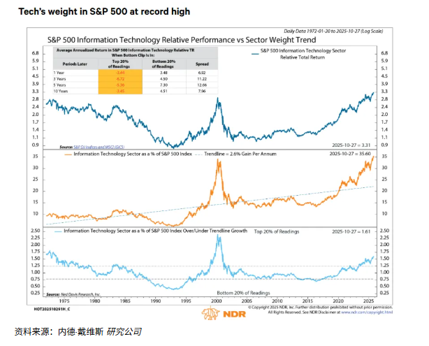 Ned Davis Research的罗布·安德森指出,自20世纪70年代以来,科技板块在标普500指数中的权重持续上升,目前已占据创纪录的比重。他指出,与长期趋势相比,当前的走势没有2000年时那么极端,但这一比例仍处于历史所有观测值的最高五分之一区间,通常预示这个板块在未来1年、3年、5年和10年将跑输大盘。