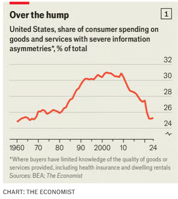 据估算,美国大约有四分之一的消费支出,仍流向信息高度不对称的商品和服务,比如医疗和家庭装修,不过这一比例已经从千禧年初的30%有所下降。