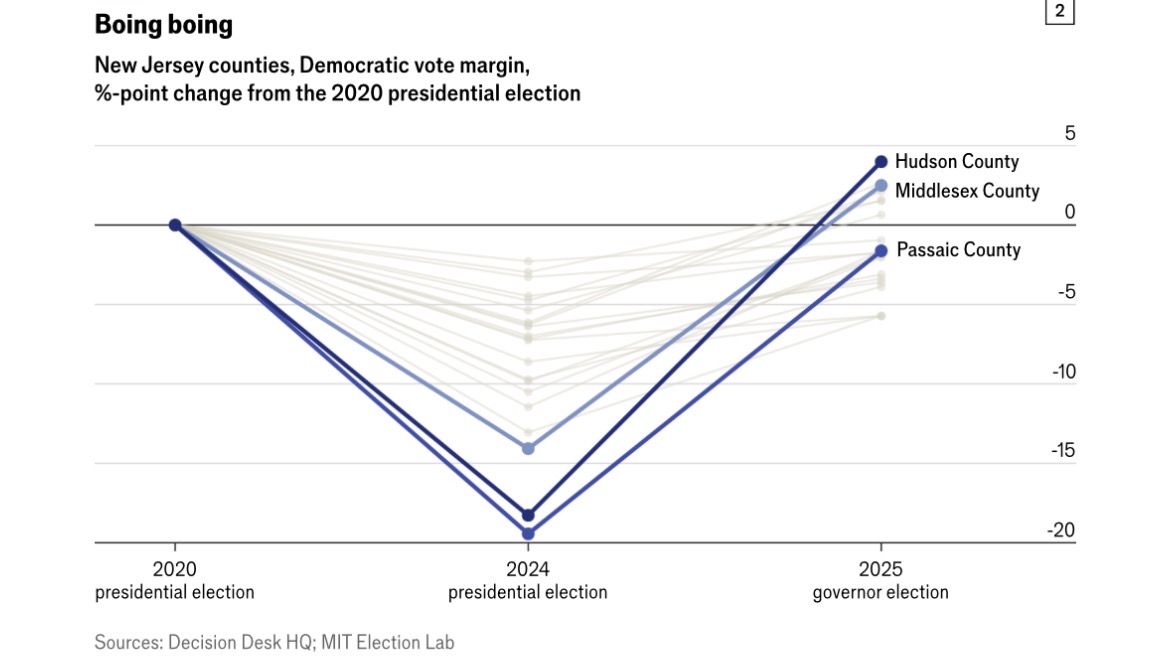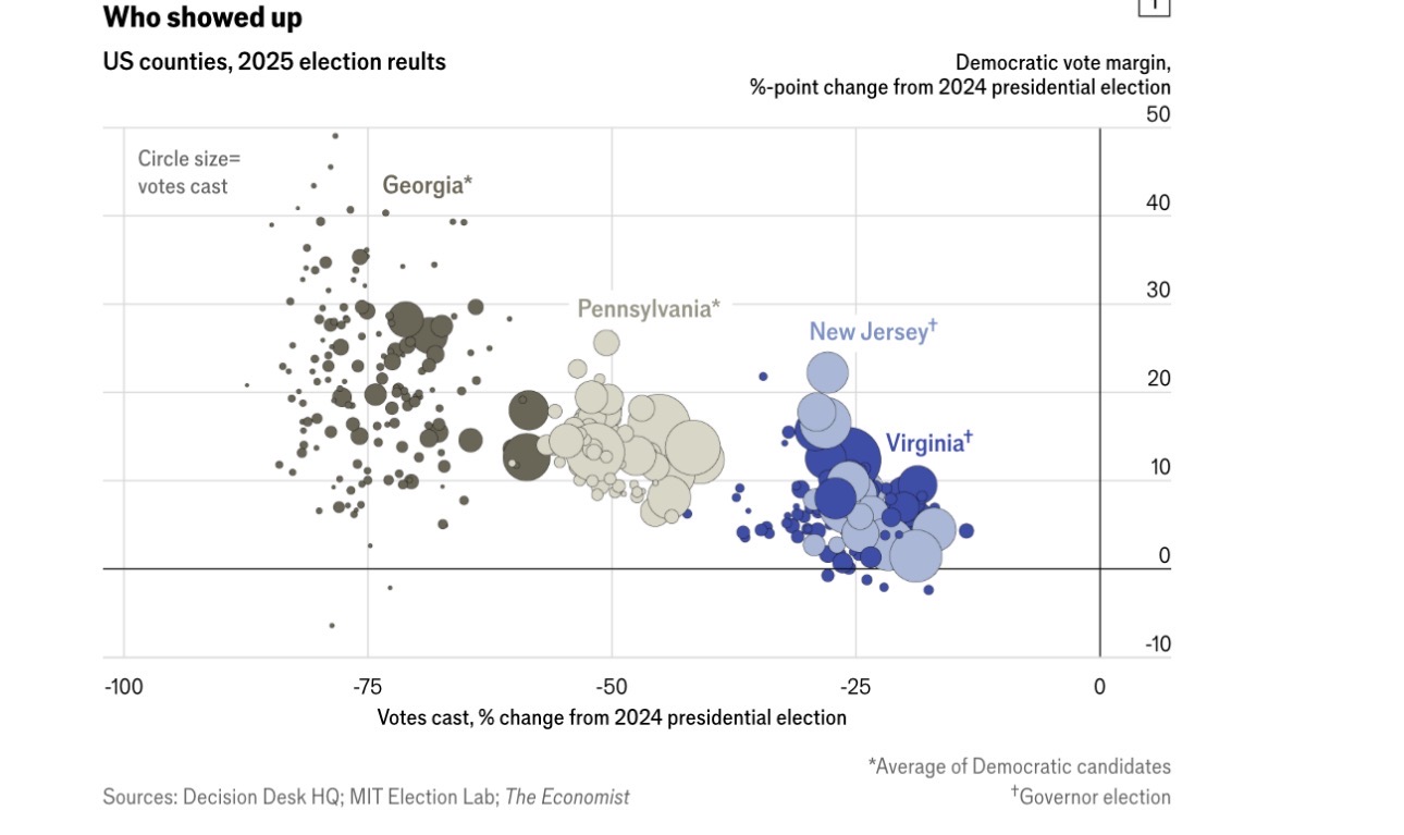 但11月4日举行的选举——也是明年中期选举前的最后一次,让民主党重新露出笑容。如今尘埃落定,《经济学人》的数据团队深入分析结果,探讨这是否意味着特朗普和共和党面临更大的麻烦。