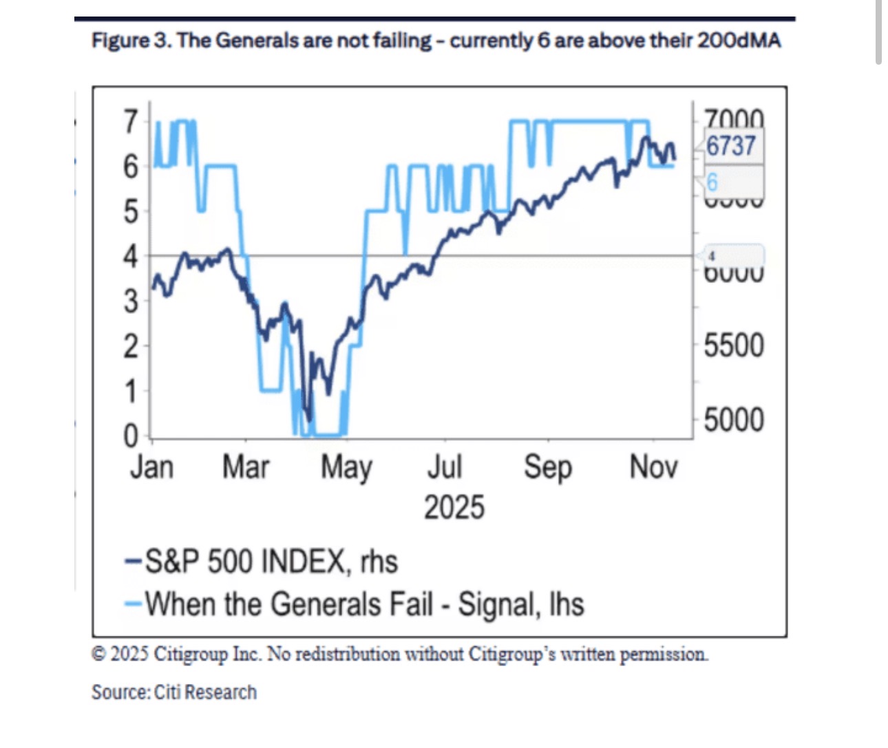 在周四晚些时候发布的一份报告中,花旗策略师亚当·皮克特团队表示,他们的“将军失利”指标仍支持大盘走势。