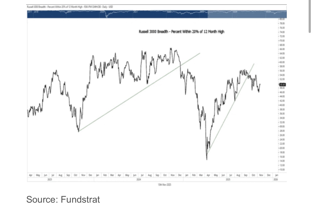 他表示,这种情况在去年底也曾出现,也发生在2022年市场见顶前,因此当市场广度开始下降时值得特别关注。