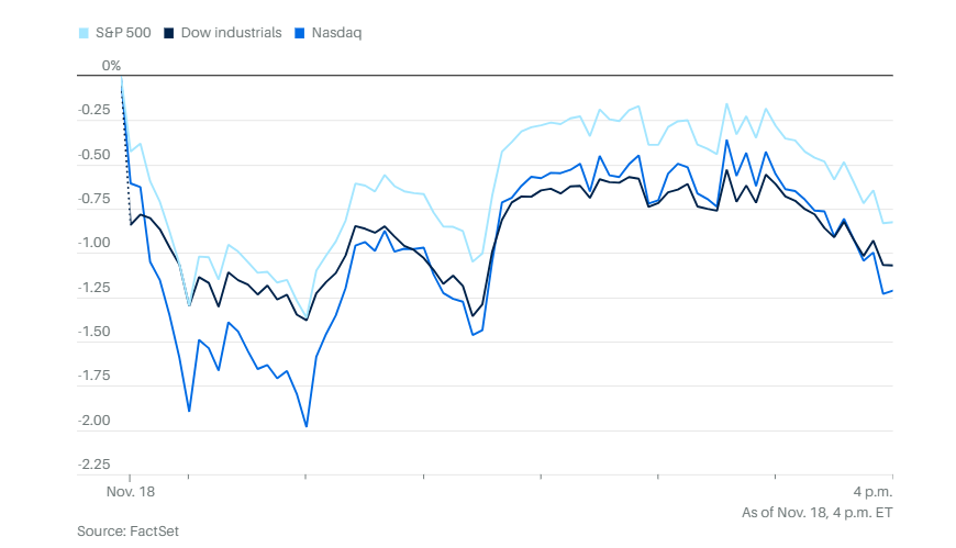 周二,股市表现惨淡,标普500指数和道琼斯指数均连续第四天下跌。半导体股票遭重创,与人工智能交易相关的股票也表现不佳。