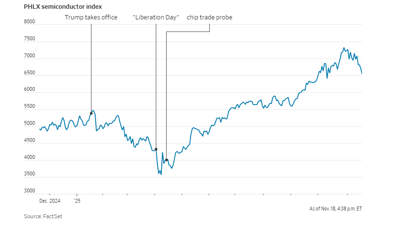 费城半导体指数(SOX)周二早盘跌入回调区间,回调通常被定义为较近期收盘高点下跌至少10%。指数下跌2.3%至6551点,跌破6595.14点的回调线,较10月29日的最近收盘高点7327.93点大幅下挫。指数上一次进入“熊市”(即从近期高点下跌20%或以上)是在1月22日至4月8日之间,期间累计下跌34.9%。