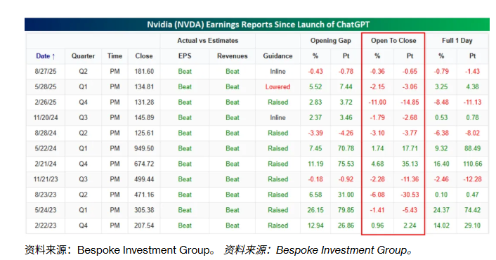 Bespoke Investment Group的数据也显示,尽管英伟达过去11次财报中有8次实现“营收、利润和前景三重超预期”,但股价却有8次在财报当天从开盘到收盘下跌,包括最近连续5次,“换句话说,尽管表现强劲,投资者还是选择获利了结。”