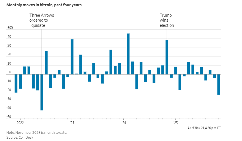 尽管特朗普政府对加密货币态度友好,且机构采用程度持续上升,比特币自10月初创下历史新高以来仍已暴跌超过30%。此次暴跌始于10月10日大规模清算,当日市场蒸发190亿美元杠杆代币头寸,导致加密货币总市值一夜间蒸发约1.5万亿美元。