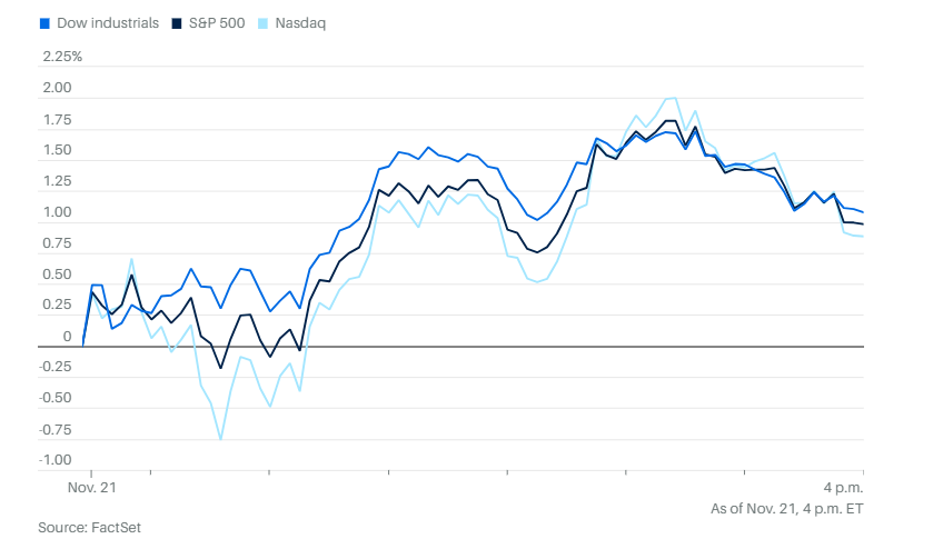 但这一轮反弹仍不足以抹去本周早些时候的深度下跌。道指、标普500指数和纳斯达克综合指数本周累计跌幅均超过1.9%。近期投资者的焦虑打压了此前涨势强劲的科技股,以及比特币等其他被视为风险较高的资产,而比特币仍面临下行压力。