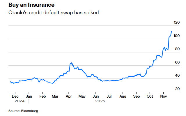 最近几天,甲骨文五年期信用违约掉期(即企业债务保险)的成本大幅上升。这波上涨,可能是银行和甲骨文商业合作伙伴出于对冲需求推动的。几十家贷款机构正忙于为雄心勃勃的Stargate项目安排超大规模贷款。