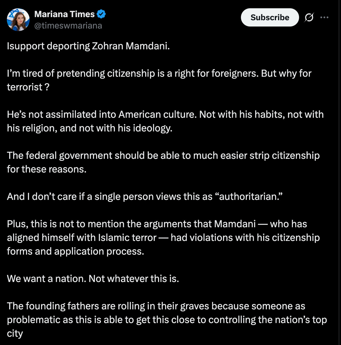 周日,有帖子称,一个知名的亲以色列、反穆斯林账号,曾呼吁将佐赫兰·曼达尼驱逐出境,其所在地是“南亚”,并已更改用户名15次。当我登陆X核实时,发现这个账号前一天还在发布截图,攻击其他政治账号是“巴基斯坦垃圾”。
