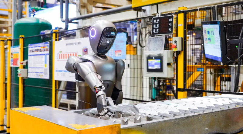 在荆州,协同工厂大脑运作的人形机器人将模具零件运送至检测站,3D相机完成质量检测。如果零件未通过,AI系统会判断并制定解决方案。